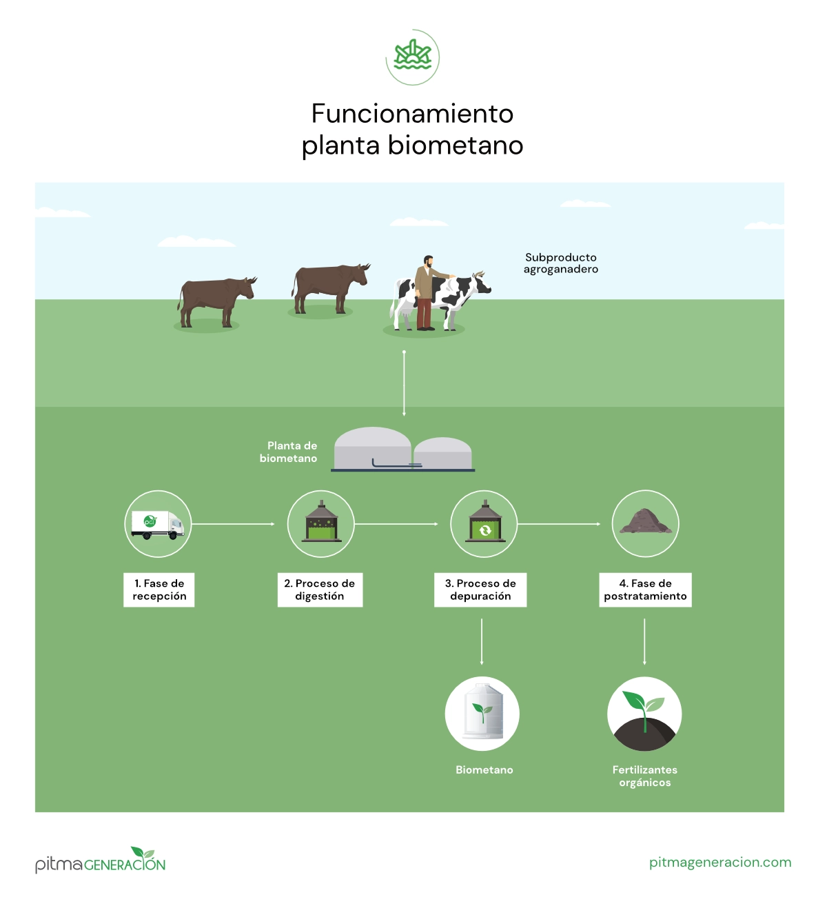 El biometano es una fuente de energía renovable y limpia que se obtiene al transformar residuos orgánicos biodegradables, como los agrícolas y ganaderos existentes en el entorno, en energía limpia.